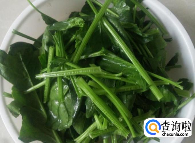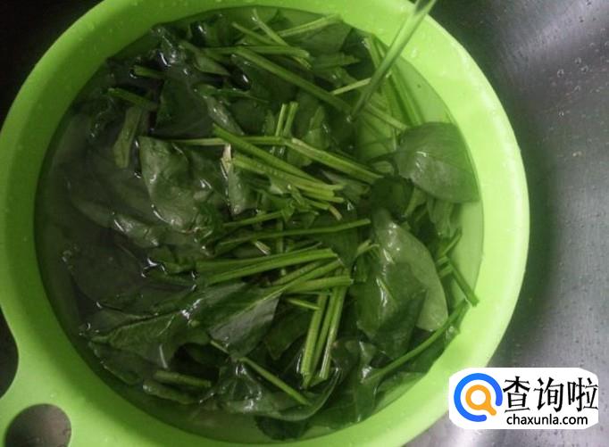 菠菜切成几段,然后放至水里清洗干净,捞上篮子沥干水分。