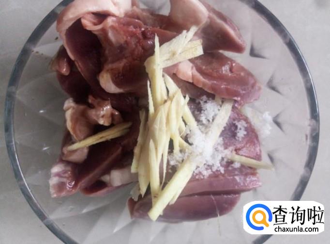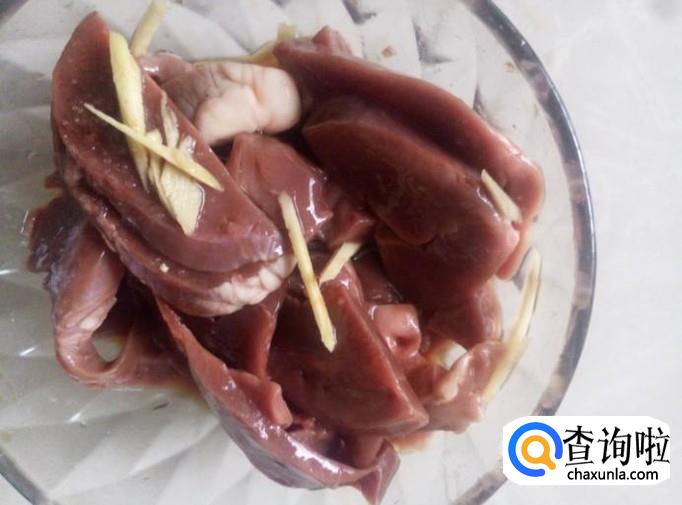 把羊心清洗干净,然后切成薄片,加适量的盐、姜丝、生抽、料酒腌制十几分钟。