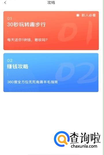 点击进入“趣步行”,我们可以看到“步行攻略”和“赚钱攻略”,在这里我们可以了解走多少步可以换取多少钱。