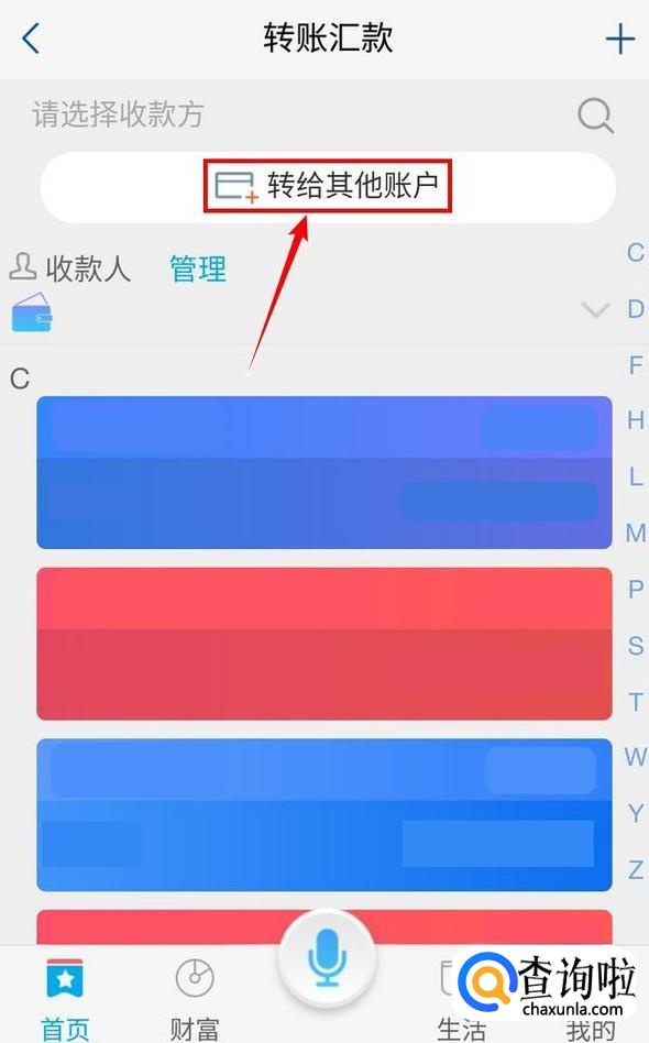 进入到转账汇款界面,已经有过转账操作的,会显示在下方,首次转账的,需要点击上方的“转给其他账户”;