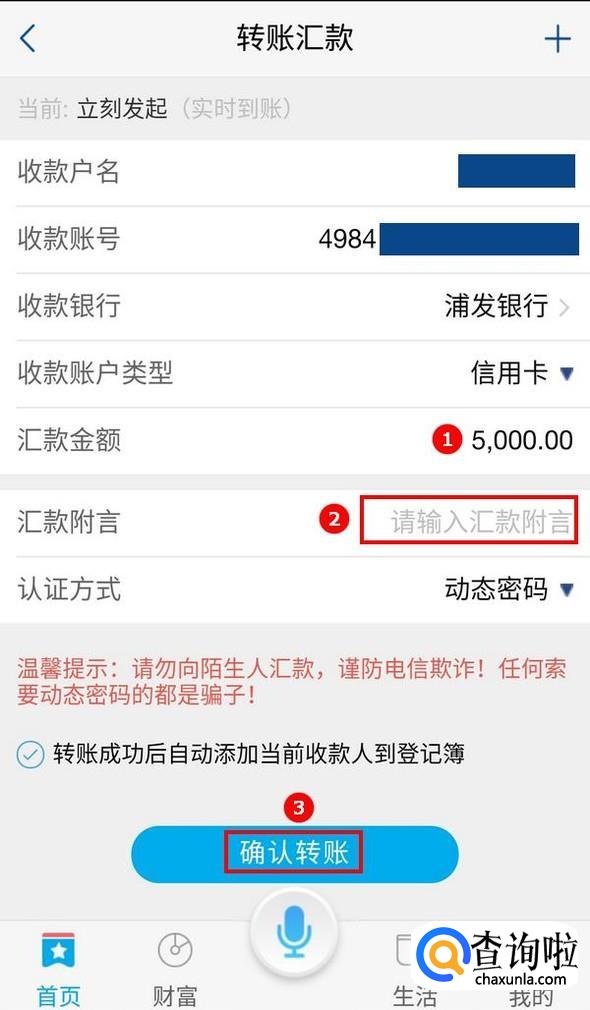 输入金额,附言可选择输入,确认无误后,点击确认转账,然后弹窗输入短信动态密码和交易密码即可;