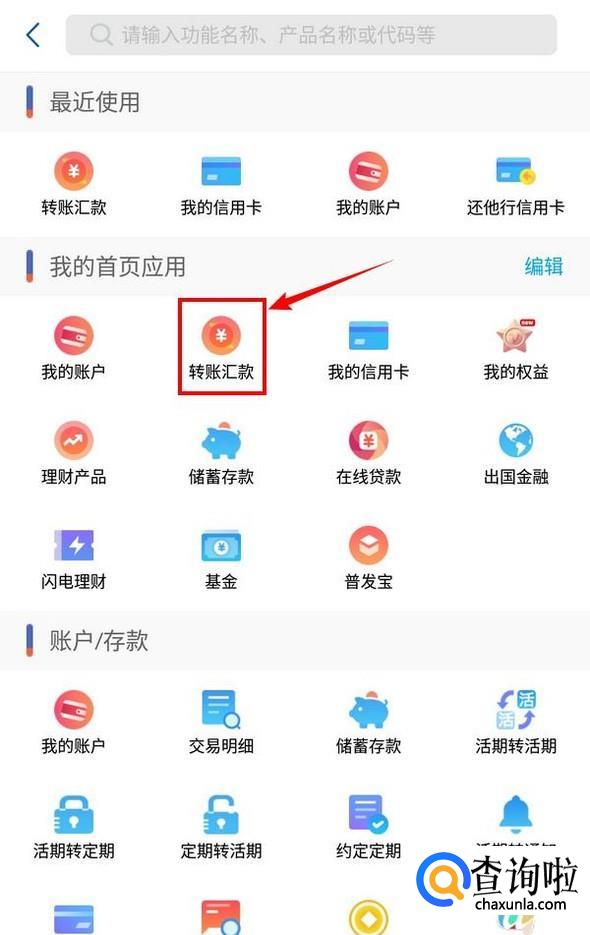 在“我的首页应用”栏或者下方的“转账汇款”栏,找到“转账汇款”选项,点击;