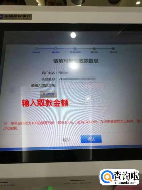 输入取款金额,点击确定,智慧柜员机辅助人员授权,打印回单。取款金额需是100的整数倍值,单次最低100元,最高10000元,存折取款申请当日有效,零点自动撤消。