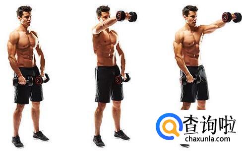 2.将哑铃从身体两侧平举,直到跟身体平行。然后慢慢落回原位。