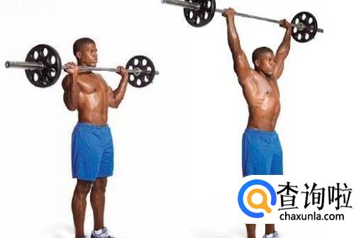 2.提起杠铃至肩上,掌心向上;把杠铃贴脸向上推起至两臂伸直在头顶上方;然后慢慢还原。