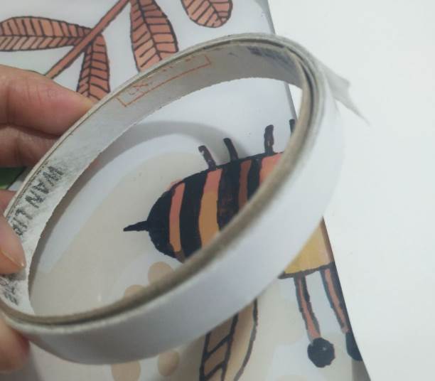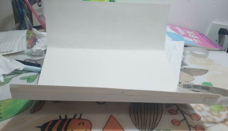 2、把卡纸大概分成三等份,其中尽头一份稍微多一点,折叠出一道印迹,以便粘合。贴上双面胶,先不要撕开贴膜。
