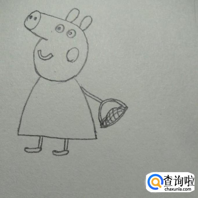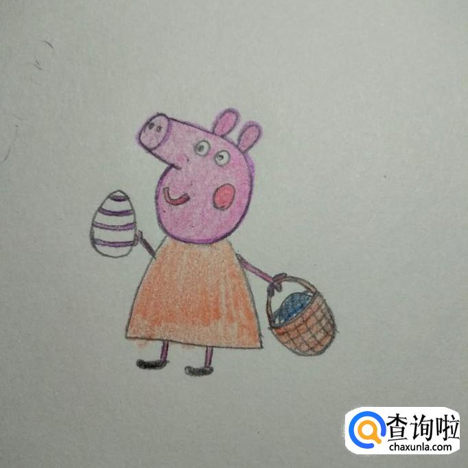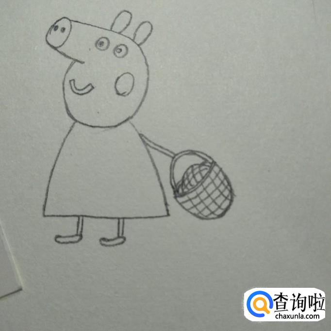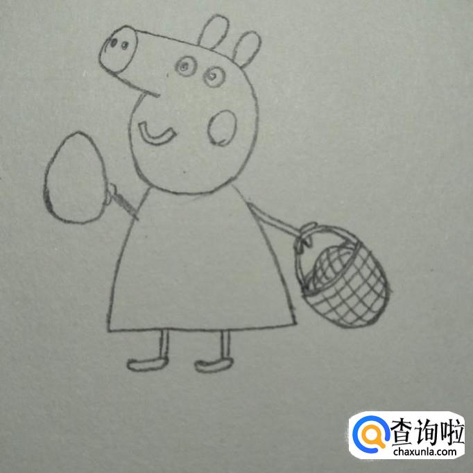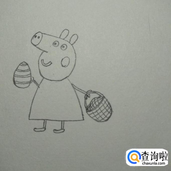 画出一只完整的篮子,在画右手部分,一只手臂和一个鸡蛋,此时,佩奇正准备将鸡蛋放入篮子中。
