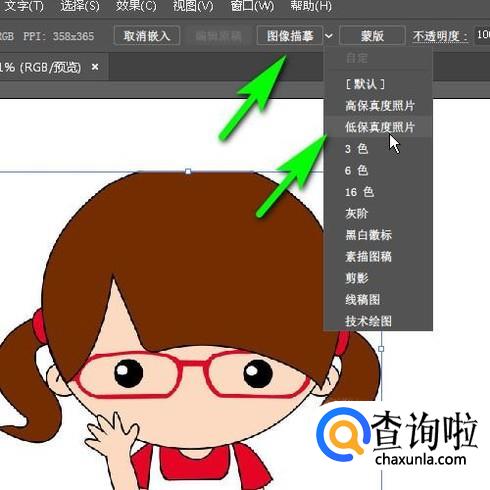 如图所示,再点击图像描摹的下拉按钮,弹出菜单再点:低保真度照片