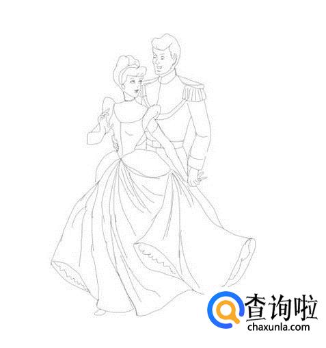 再在王子的头部下面画出王子的身体及衣服,然后再画出王子的胳膊及手部,这样简笔画公主和王子就画好了,如图所示: