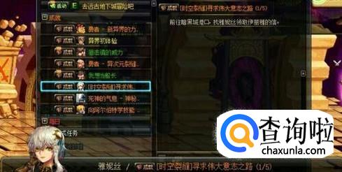 地下城的寻求伟大意志之路一共有五个任务,在第一个任务中玩家前往暗黑城港口,寻找雅妮丝拿到伊利娅交给她的一封信,看完信后和雅妮丝对话,然后去到另一个世界。