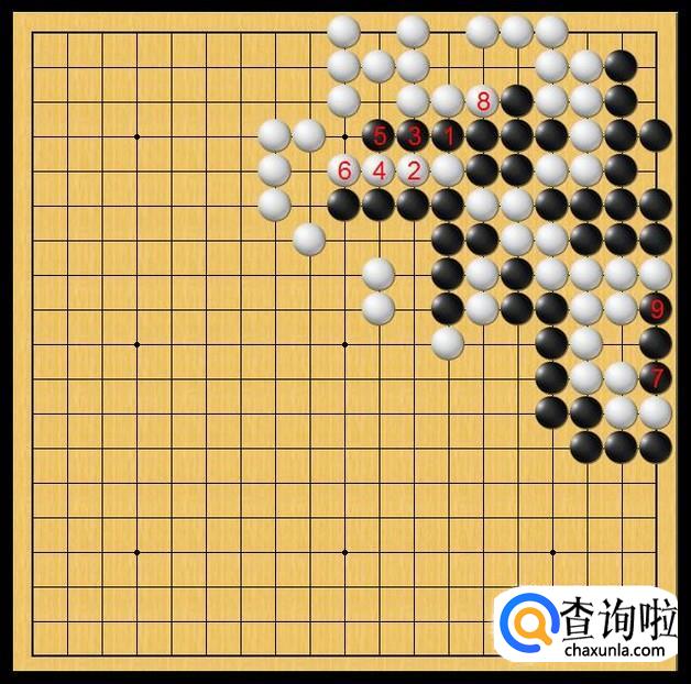 黑棋继续在右下角底边黑9处落子,黑9落子后叫吃右下角白棋大龙。如图所示。