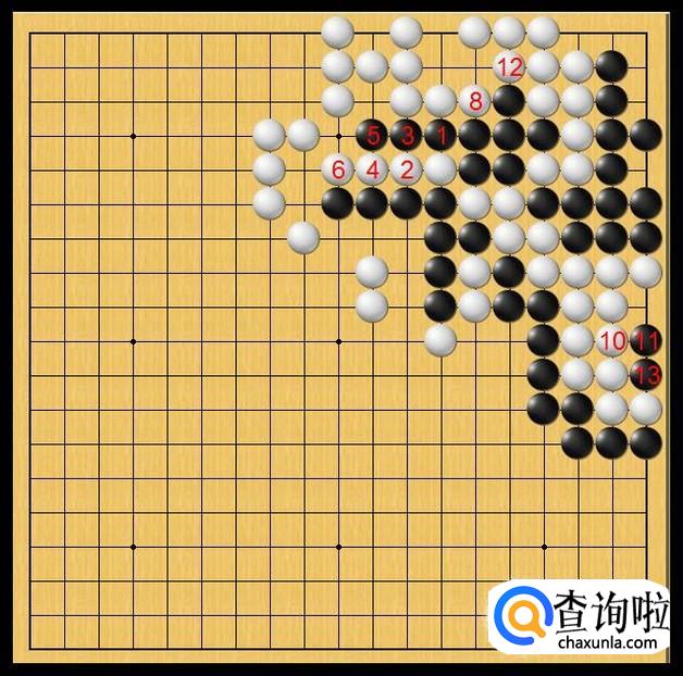 黑棋也于黑13处落子,黑13落子后,黑棋打吃右下角白棋大龙。尽管白棋可以打吃右下角黑二子,但黑棋仍会在被打吃的地方落子继续打吃右下角白棋大龙。白棋大龙就会被黑棋打吃。这样,打吃掉了右下角白棋大龙后。整个局面的黑棋全部连接,黑棋取胜应该不成问题。如图所示。