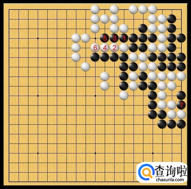 黑棋忽然在右下角底边黑7处落子,黑棋开始进攻右下角白棋的大龙来了。如图所示。