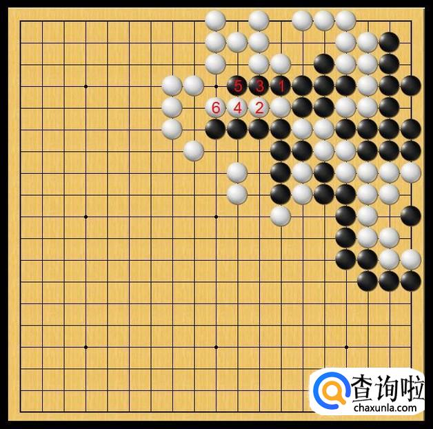 黑棋继续于黑5处长,黑5长后,打吃中路的白三子。看样子,对于中路的白三子,黑棋如鲠在喉。如图所示。