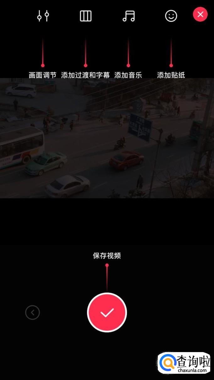 点击红色键就可以开始录制视频,每段视频自动停止。当录完四段视频后,会有保存键,点击即可保存,并且进入后期板块。后期栏有画面调节,添加过渡和字幕,添加音乐,添加贴纸四个功能。如图所示: