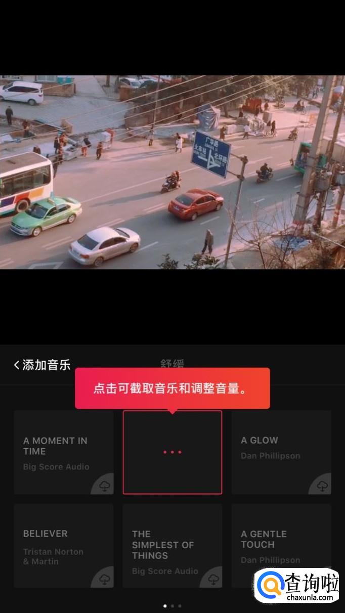 点击添加音乐,可以选择自己喜欢的音乐或者系统自带音乐。点击所要插入的音乐,还可截取音乐片段和调节音量,使音乐和画面更加的平衡。
