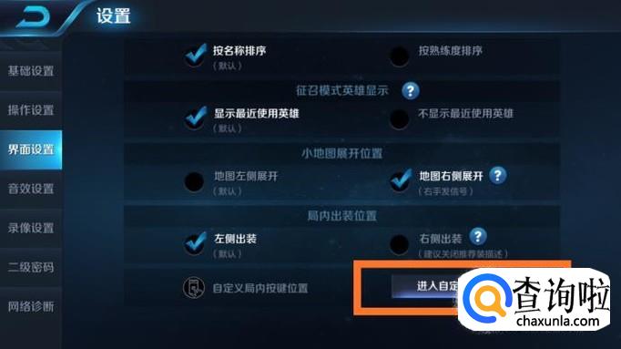 在这里可以选择局内小地图的位置以及出装位置,点击“进入自定义面板”可以进行更多自定义设置。