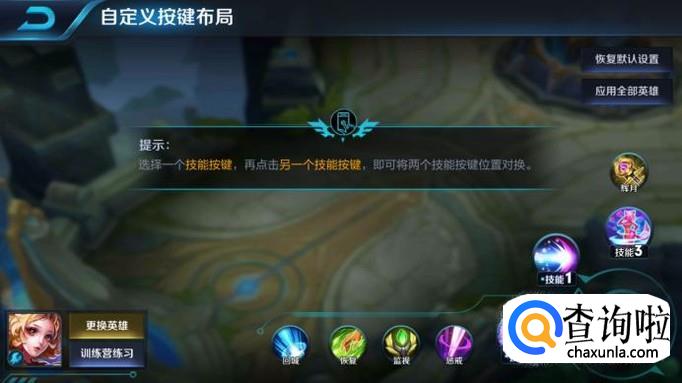 先在左下角选择一个英雄,然后先点击一个技能,然后再点另外一个技能,两个技能就会交换位置,点击“应用全部英雄”将把这个更换应用到所有英雄身上。