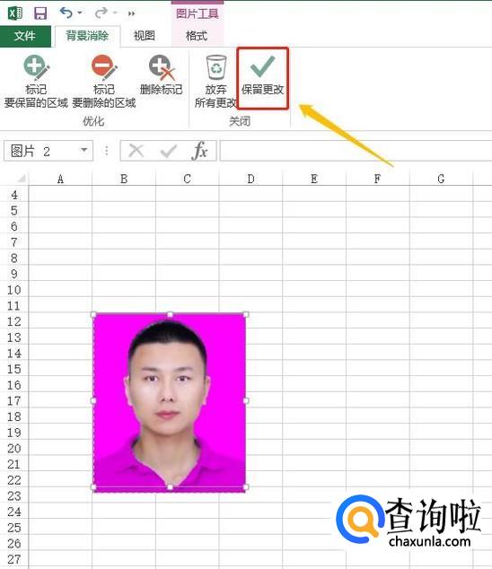接着以上步骤,点击了图片格式工具以后,表格的左上角会出现一项"删除背景",点击这里之前的照片背景色就变成了紫红色,如图所示...