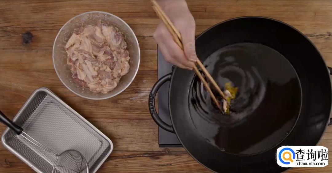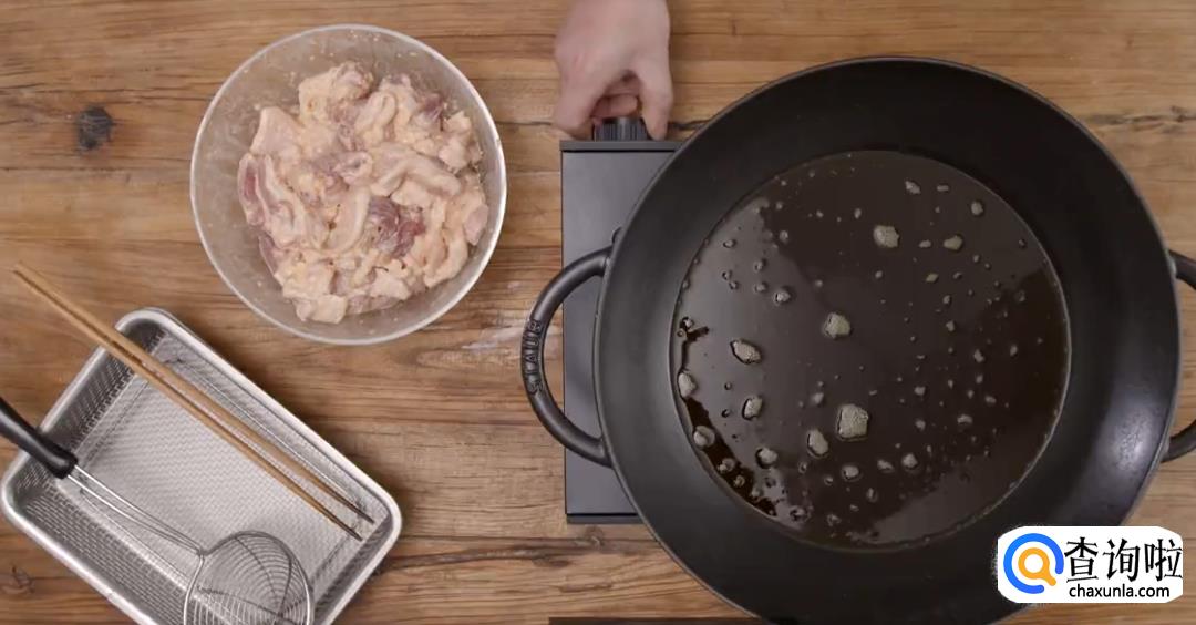 油温烧至七成熟,将肉片下油锅继续炸至两面金黄,就可以捞出摆盘了。