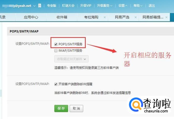 接下来登录需要设置的邮箱网页版,找到邮箱设置界面,开启相应的服务器,如下图所示