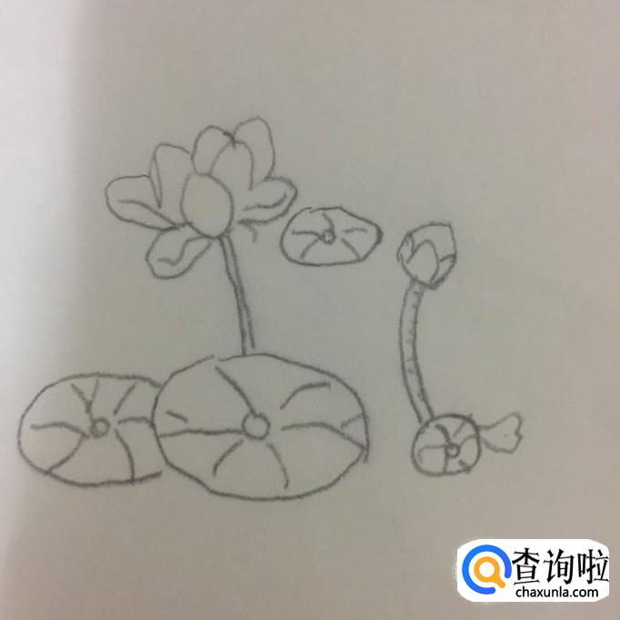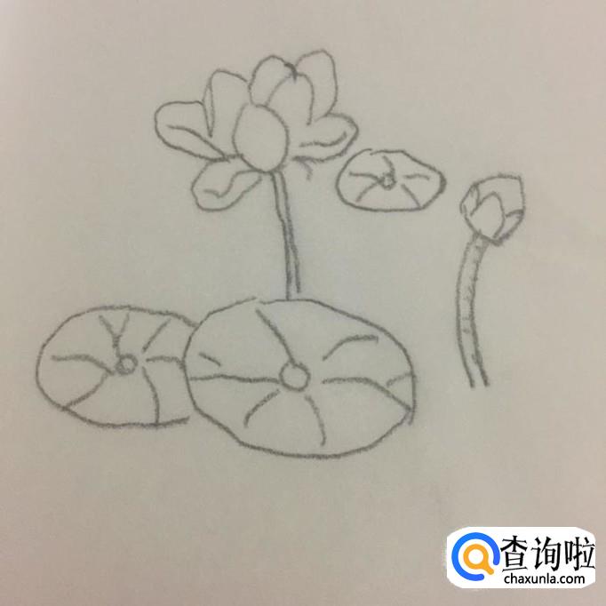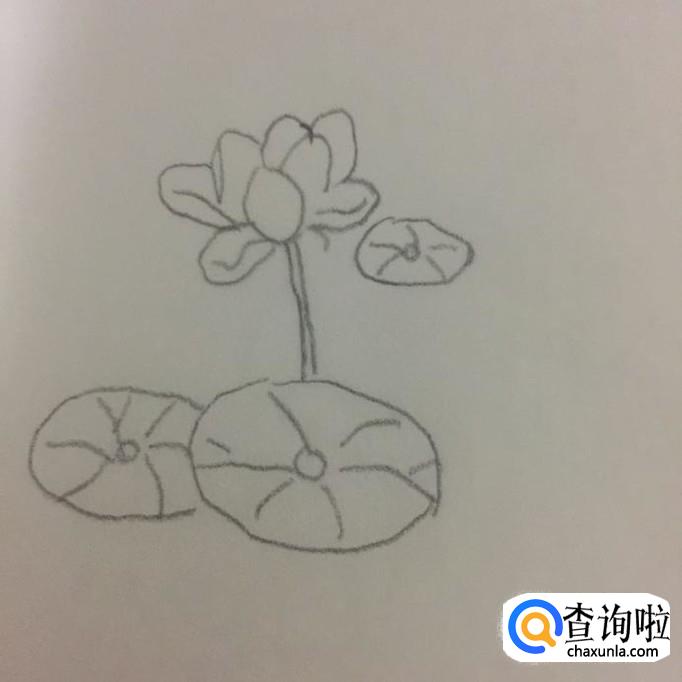 接着画出三片大小不一的荷叶,如下图所示。荷叶可以画成椭圆,然后在椭圆内部画成荷叶的叶脉就可以了。