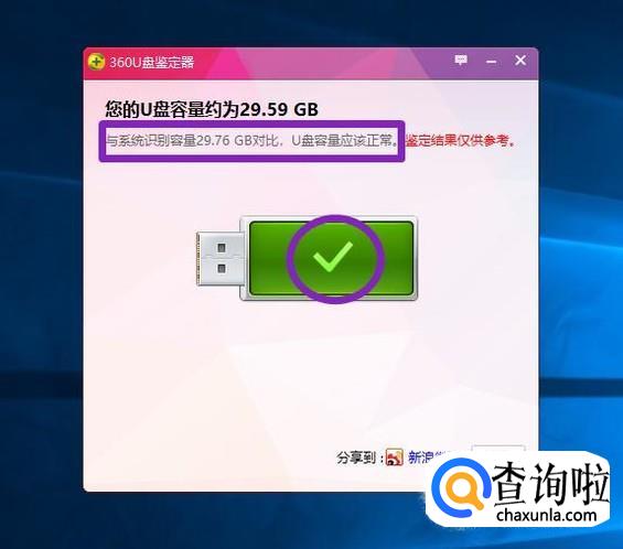 最终结果如图所示,我们看到一个勾选,而且还有鉴定的结果,说明我们插入的这个U盘是真的。