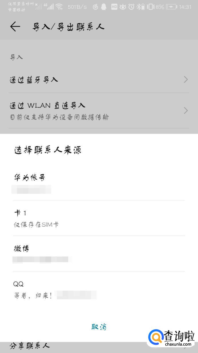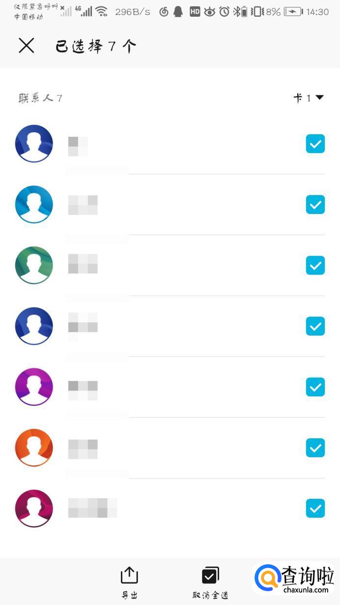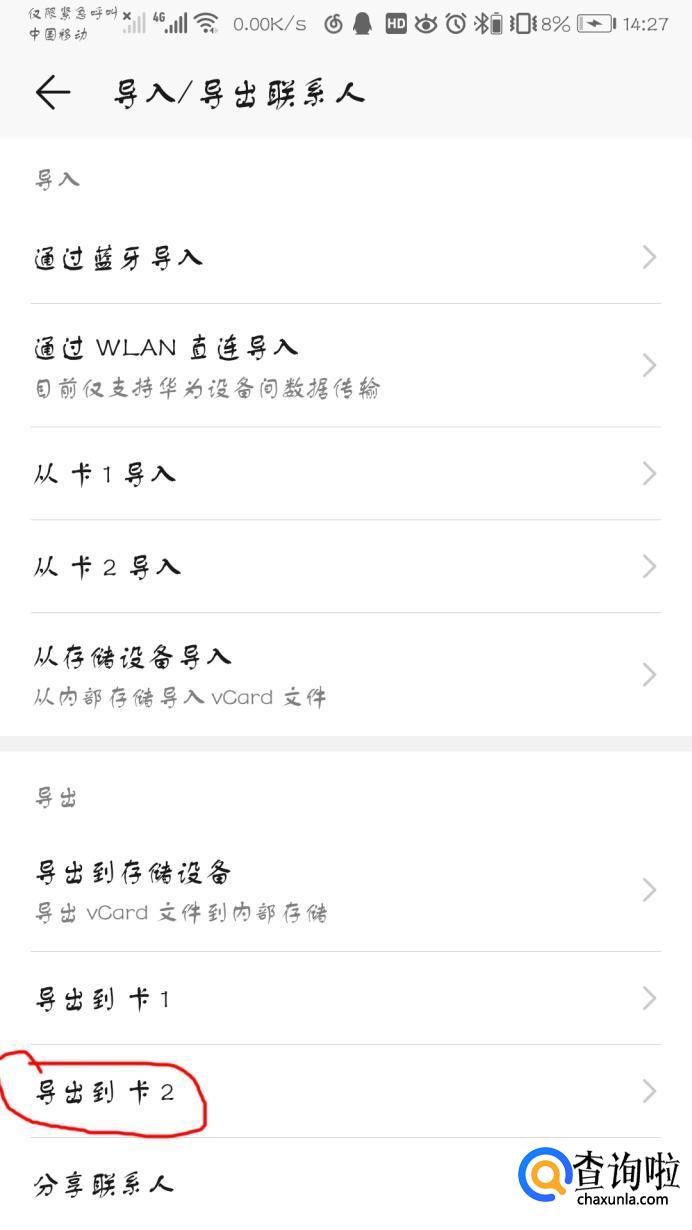 若导出到卡2,点击后。弹出窗口,选择联系人来源即需要导出到卡2的号码储存的位置。