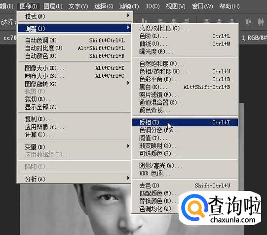 在弹出的列表中,鼠标放在“调整”这里,右侧弹出子菜单再点:反相
