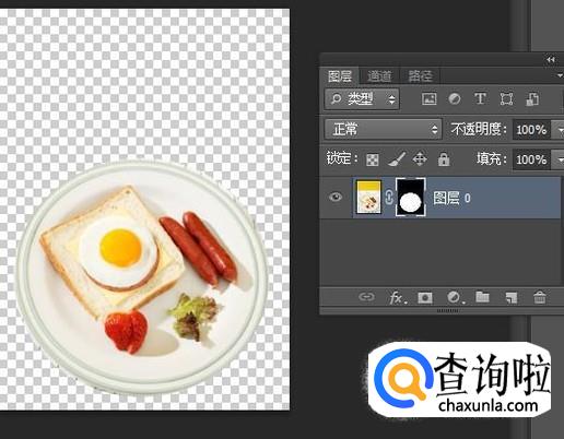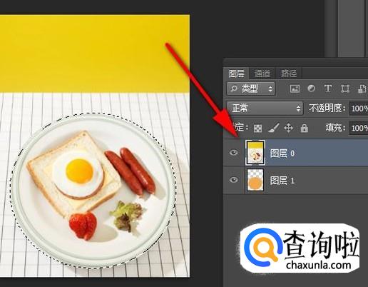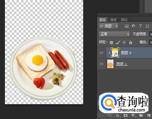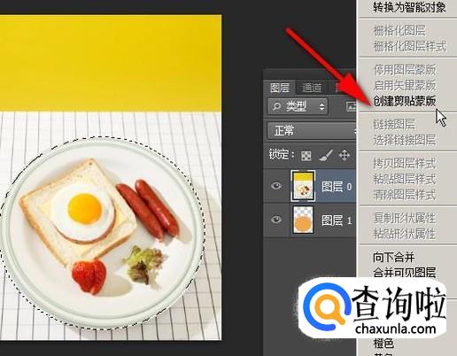 选中“创建剪贴蒙版”,再按下CTRL+D取消选择状态;盘子即被抠出来。