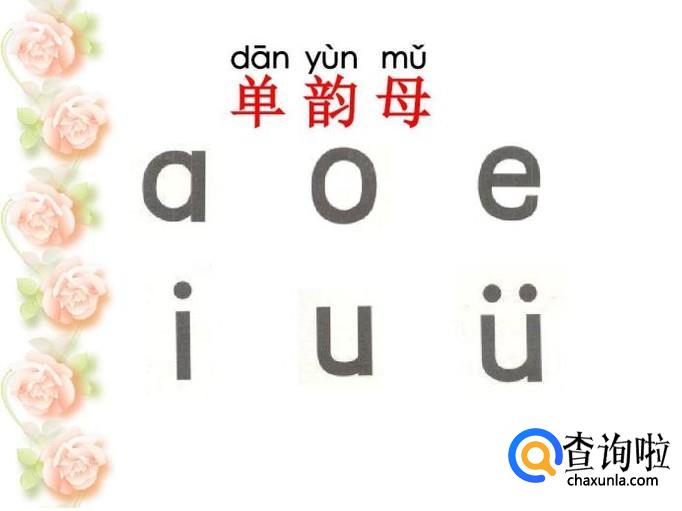 单韵母是由单纯元音构成的韵母,分别是a、o、e、 ê、i、u、ü、-i(前)、-i(后)、er(特殊元音韵母)。