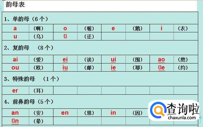 韵母按结构可分为单韵母、复韵母、鼻韵母(前鼻韵母和后鼻韵母)。