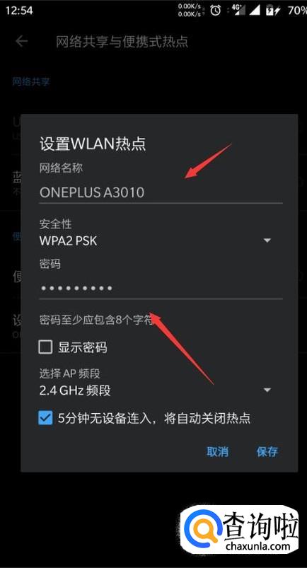在这里输入热点名,热点的密码,点击确定。热点就创建完毕了