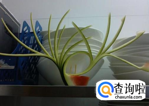 如果想让西瓜另类起来的话,可以直接在吃完西瓜的时候将西瓜皮留下来,然后把西瓜皮的白色部分去掉,直接留下西瓜皮的绿色部分。然后用美工刀,把西瓜皮做成水果拼盘的拉花。