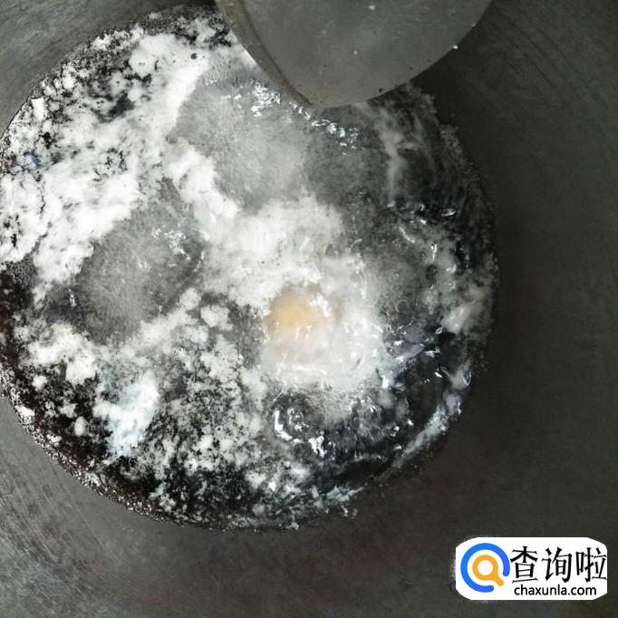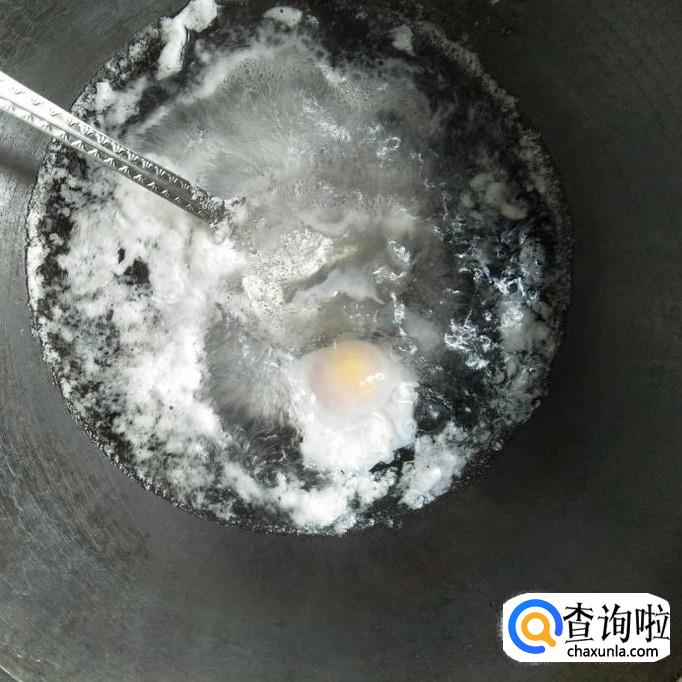 然后,我们小心的顺着锅底将鸭蛋打入水中,小火慢煮