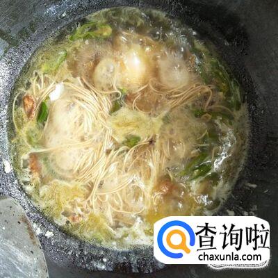 然后,就是我们四川妹子最爱的辣味了,我们向其中加入我们自制的清油辣椒适量,搅拌均匀,大火慢煮,大概3分钟后,家盐适量,味精一点,搅拌均匀,起锅