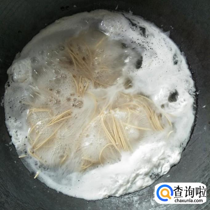 水开后,我们向其中加入适量的面条,然后用筷子搅拌均匀,防止面条黏在一块,难以煮熟