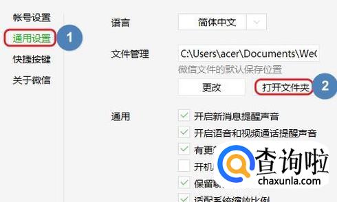 在设置对话框,我们点击“通用设置”,然后在右侧页面里点击文件管理下的“打开文件夹”;
