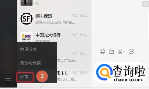 登录以后,点击微信客户端左下角的“更多”选项,也就是三条横线的那个图标,接着在右侧弹出的小窗口里点击“设置”;