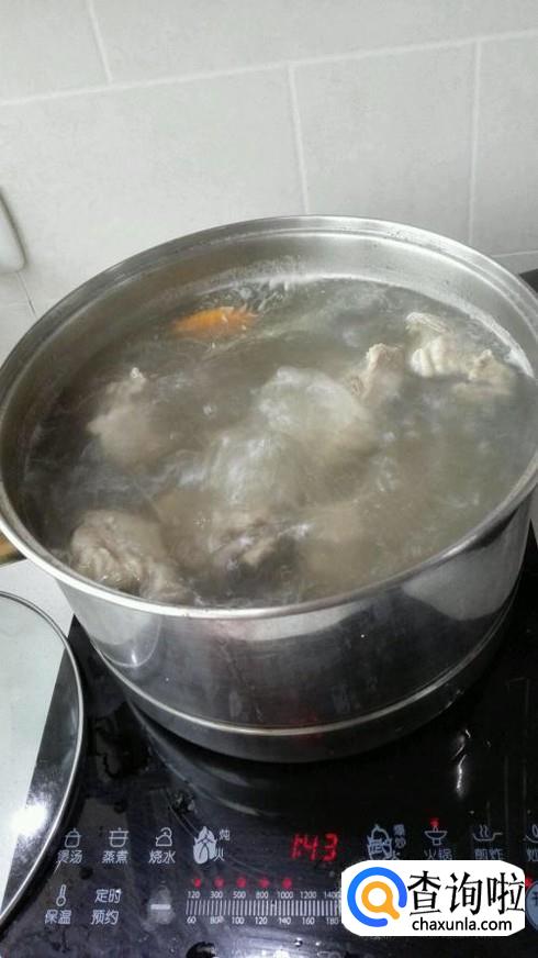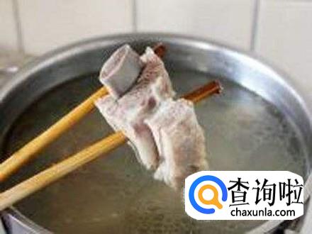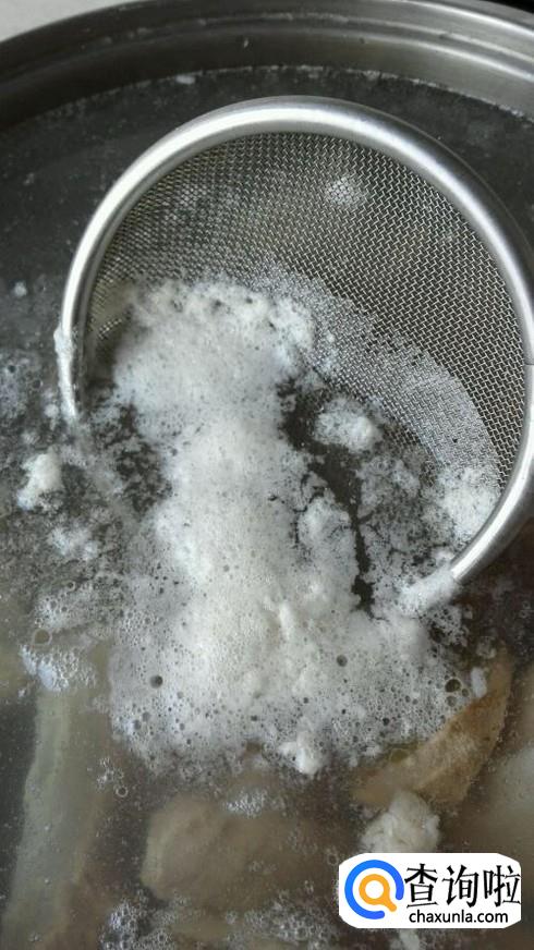 用勺子把上面的浮末撇去,煮上五分钟左右,然后把羊肉捞出,用清水冲洗一下