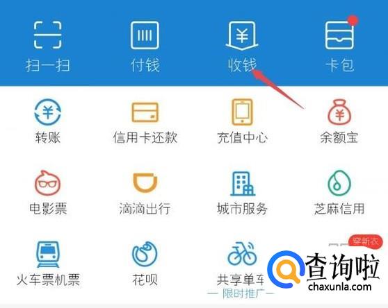 在支付宝首页面上找到“收钱”点击进入。