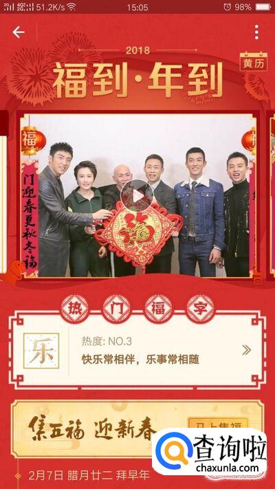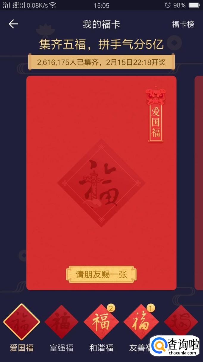 收集福卡时间为2018年2月6日00:00-2月16日22:00,活动中福卡可任意转赠给好友,集齐五张福卡就可在2月15日22:18拼手气瓜分5亿现金红包!