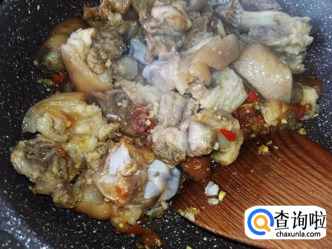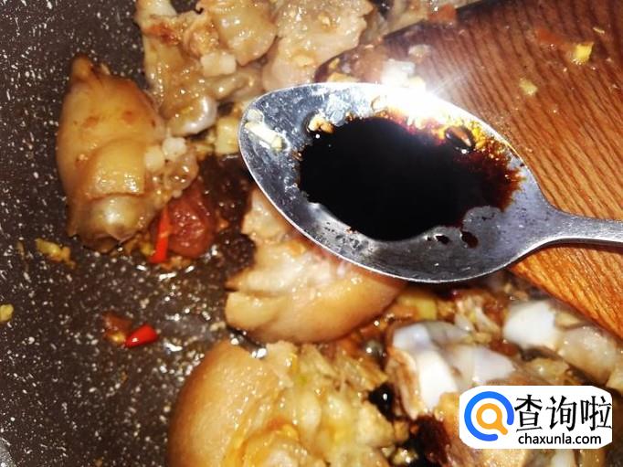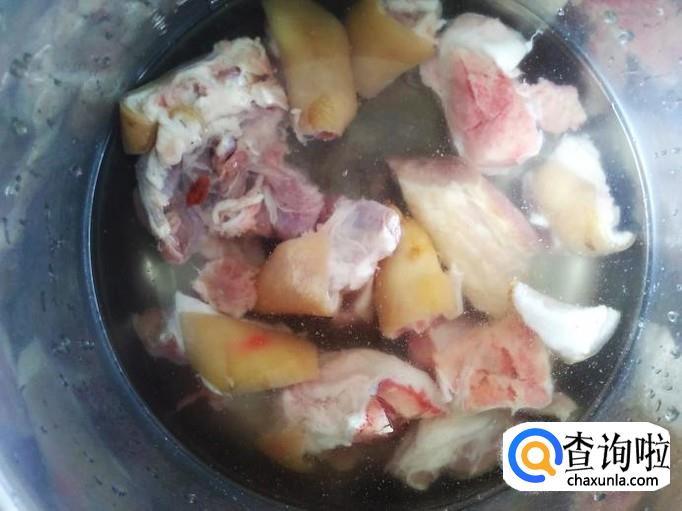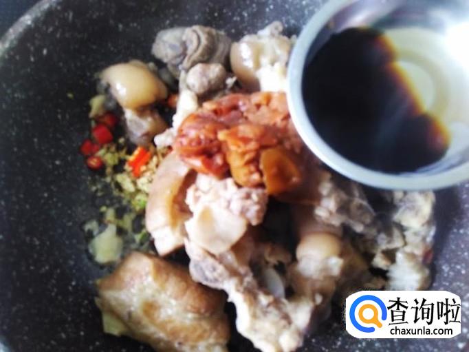 猪脚下锅,放梅蓉进去,加适量的盐、2勺生抽、1勺料酒。
