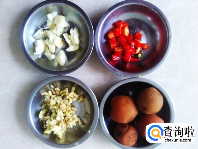 酸梅、小米辣、蒜米、姜蓉准备好,然后把酸梅抓成果泥。