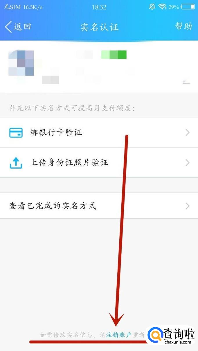在图示位置可以看到“若修改实名信息,请注销账户重新实名”,点击“注销账户”。