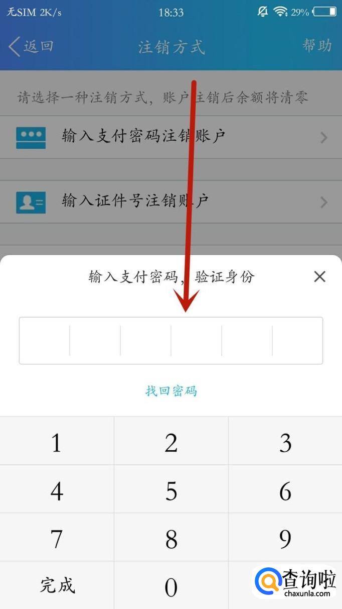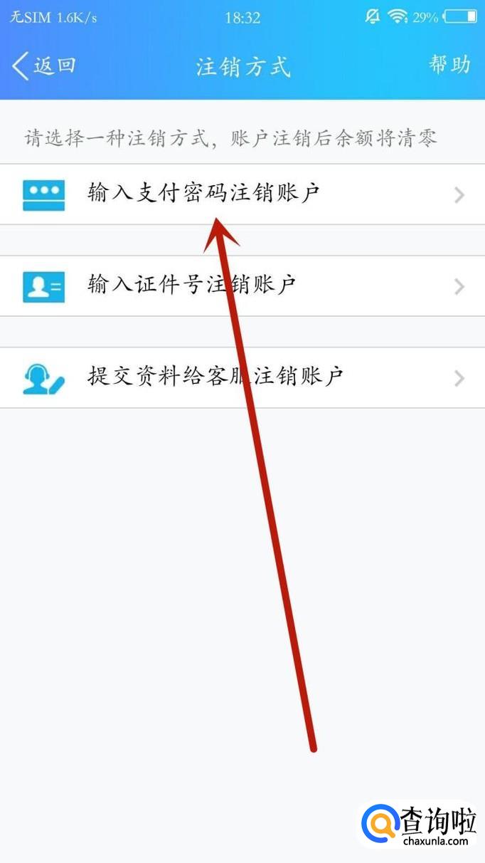 进入之后可以看到三种注销方式,点击“输入支付密码注销账户”,如图所示。