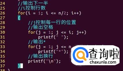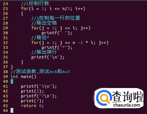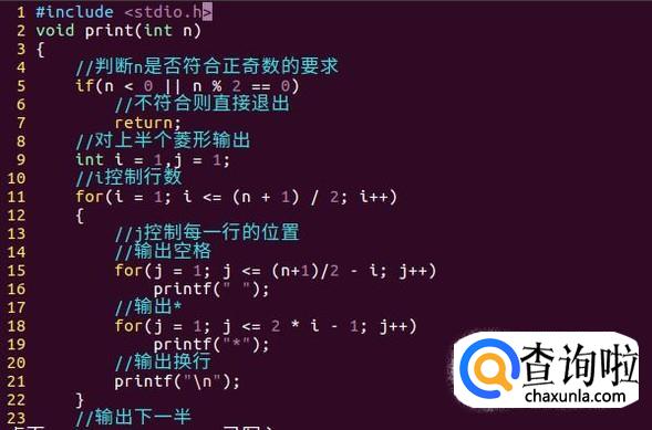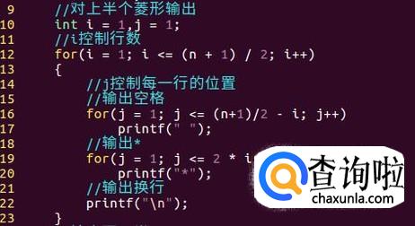 接着对上半个菱形进行输出(包括最长的行)。使用两层循环进行输出,分别控制行数与行内的位置。