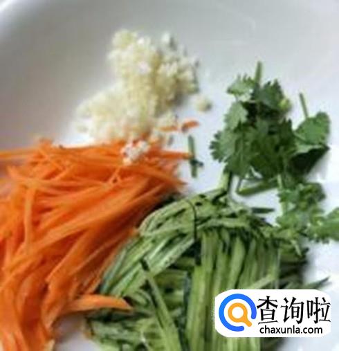 把黄瓜,胡萝卜,紫园菜全部切成丝,香菜切成小段,大蒜切成末。