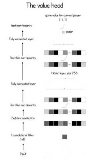 这个网络稍微复杂一点。除了标配之外,还要再多加一个全连接层。最后,用双曲正切 (Hyperbolic Tangent) 算出 (-1,1) 之间的数值,来表示当前状态下的赢面多大。