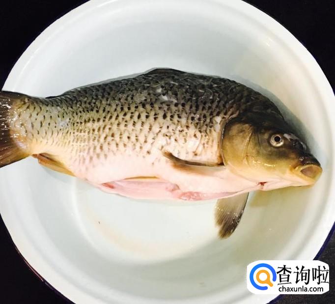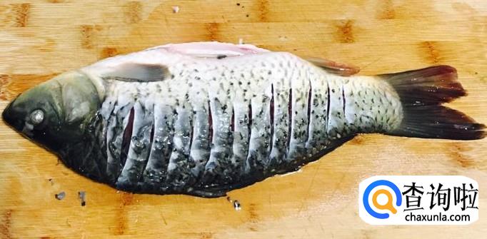 鲜活鲤鱼一条宰杀刮掉鱼鳞,剪开腹部去除内脏和鱼腮并清洗干净。用刀把鱼的两面改均匀的花刀方便入味儿。改刀前先把靠近腮和尾部的地方切一刀抽出鱼腥线